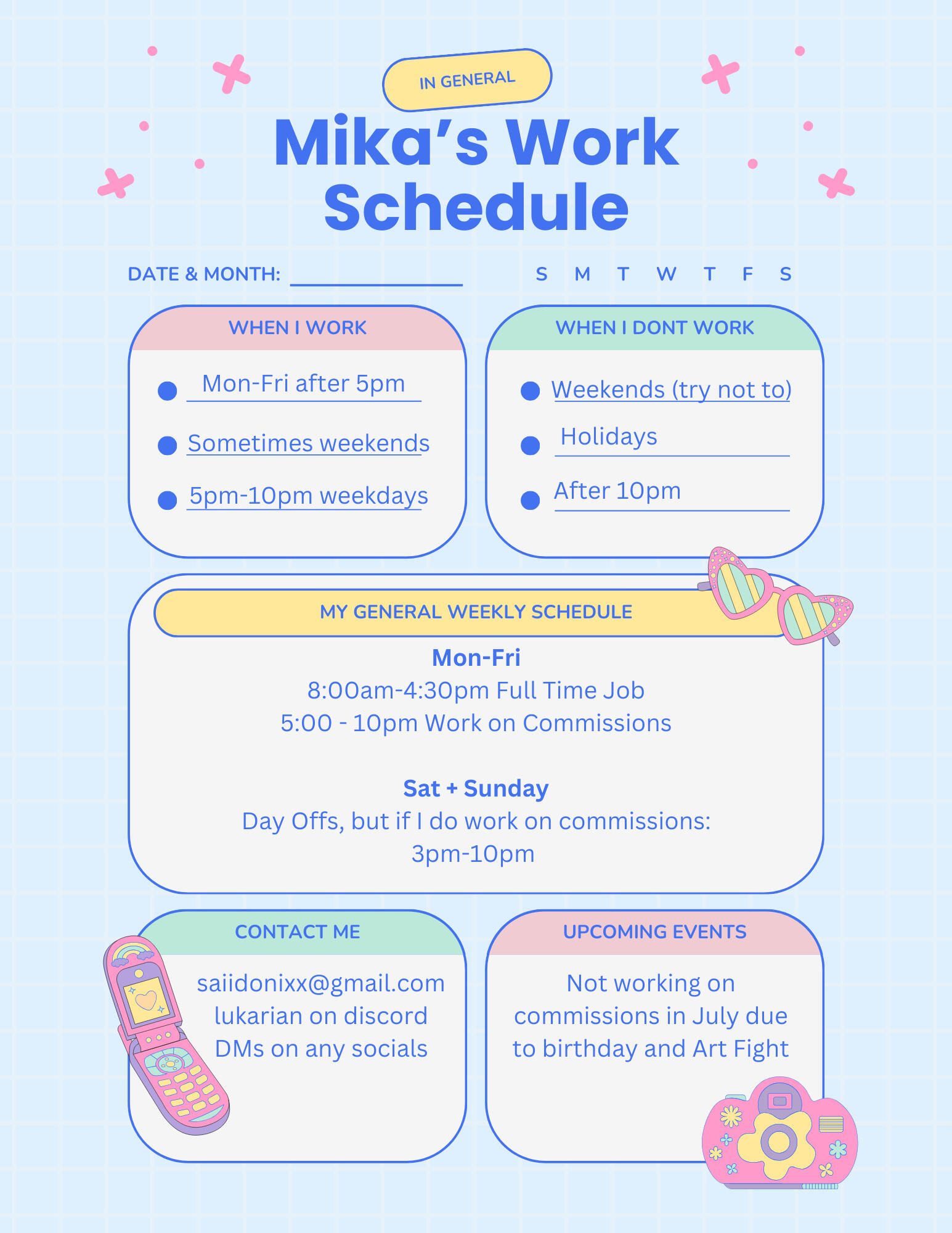 this schedule is outdated and needs revision. at this time, i try to work only on the weekends or after work, but only from 5pm-7pm